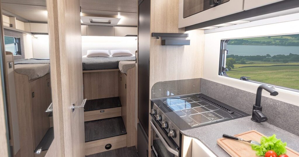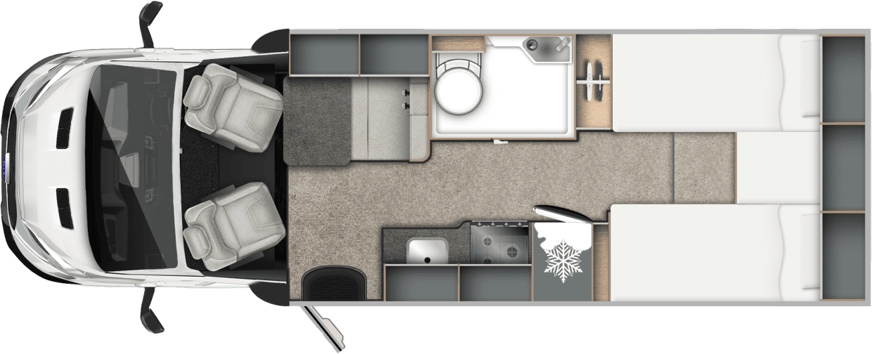 The 690T benefits from a forward seating area which converts to a extra single plus the large rear single (or double) beds. Ideal for couples or small families thinking of doing some wild camping.