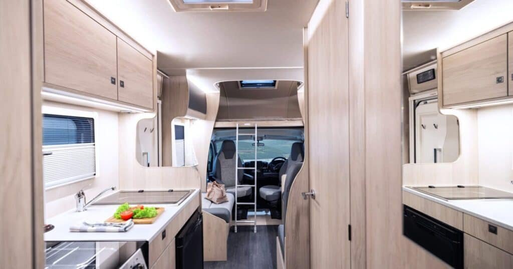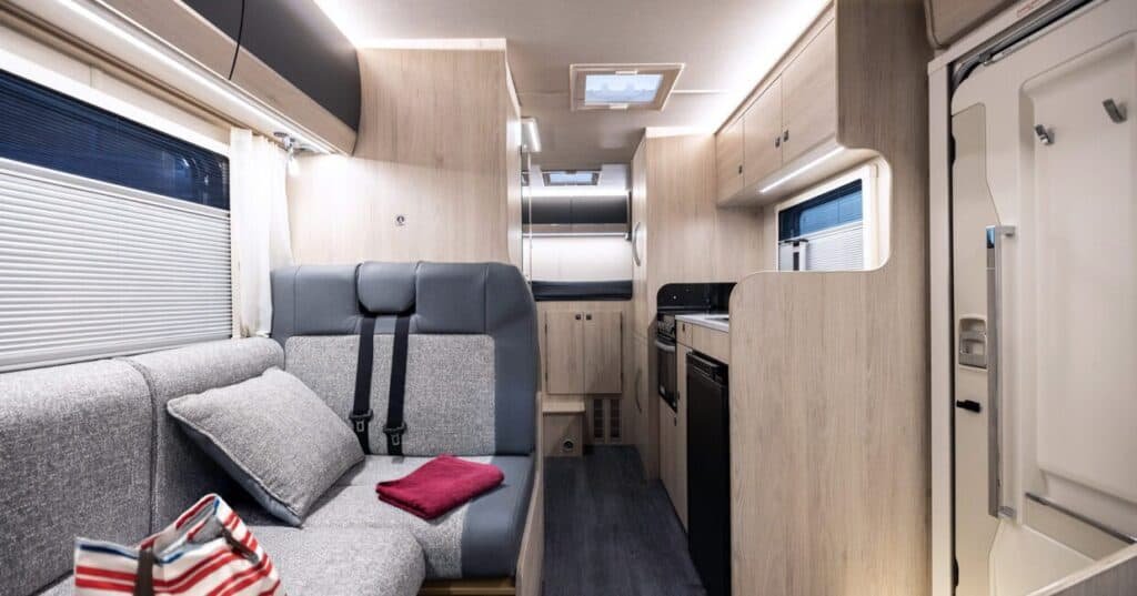 Step inside and explore the cozy confines of your home on wheels. Picture yourself in the spacious living area, complete with plush seating and panoramic windows offering breathtaking views of nature.